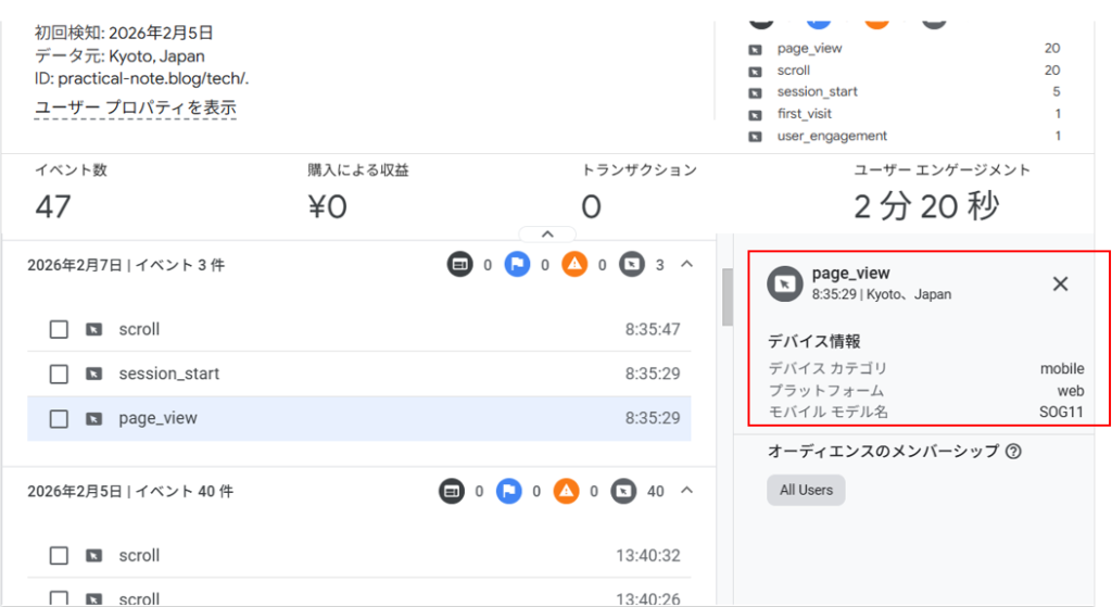 ユーザーが page_view を行った際、右側の詳細画面に情報が追加されます。